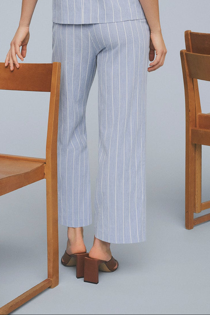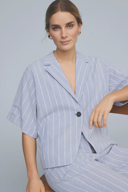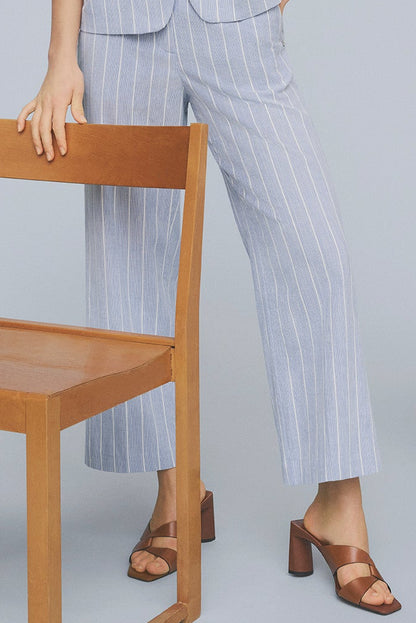 Brug bukserne sammen med den matchende kortærmede blazer for at skabe et gennemført og moderne sæt til sommerens begivenheder. Du kan også kombinere dem med en enkel hvid t-shirt og et par flade sko for et afslappet hverdagslook, hvor det stribede mønster får lov til at være i fokus. Buksernes snit gør dem velegnede til både kontoret og en hyggelig frokost i byen.
