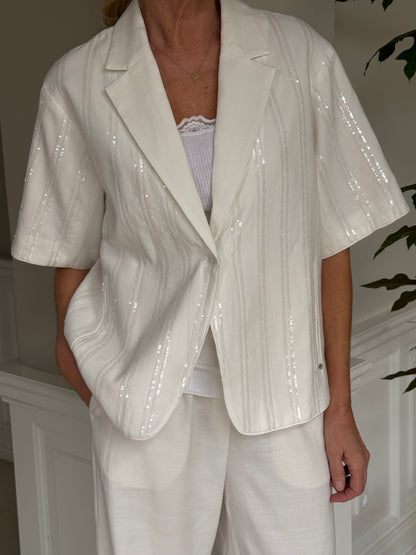 Latina er en smuk blazer i en klassisk off white farve, der skiller sig ud med sine fine lodrette striber af pailletter. Blazeren har korte ærmer og en elegant revers, som giver et let udtryk. Den lukkes med en enkelt knap foran og er fremstillet i en materialeblanding med lyocell og bomuld, der giver stoffet en flot struktur.
