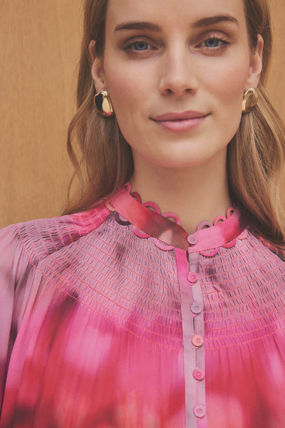 Denne Amber bluse fra Gustav er prydet med et levende mønster i pink nuancer, der giver et friskt udtryk. Blusen er fremstillet i 100% viskose og har fine detaljer som smocksyninger ved halsudskæringen og en gennemgående knaplukning foran. De korte ærmer og den lille krave er afsluttet med dekorative buekanter, der tilføjer en feminin detalje til det lette stof.
