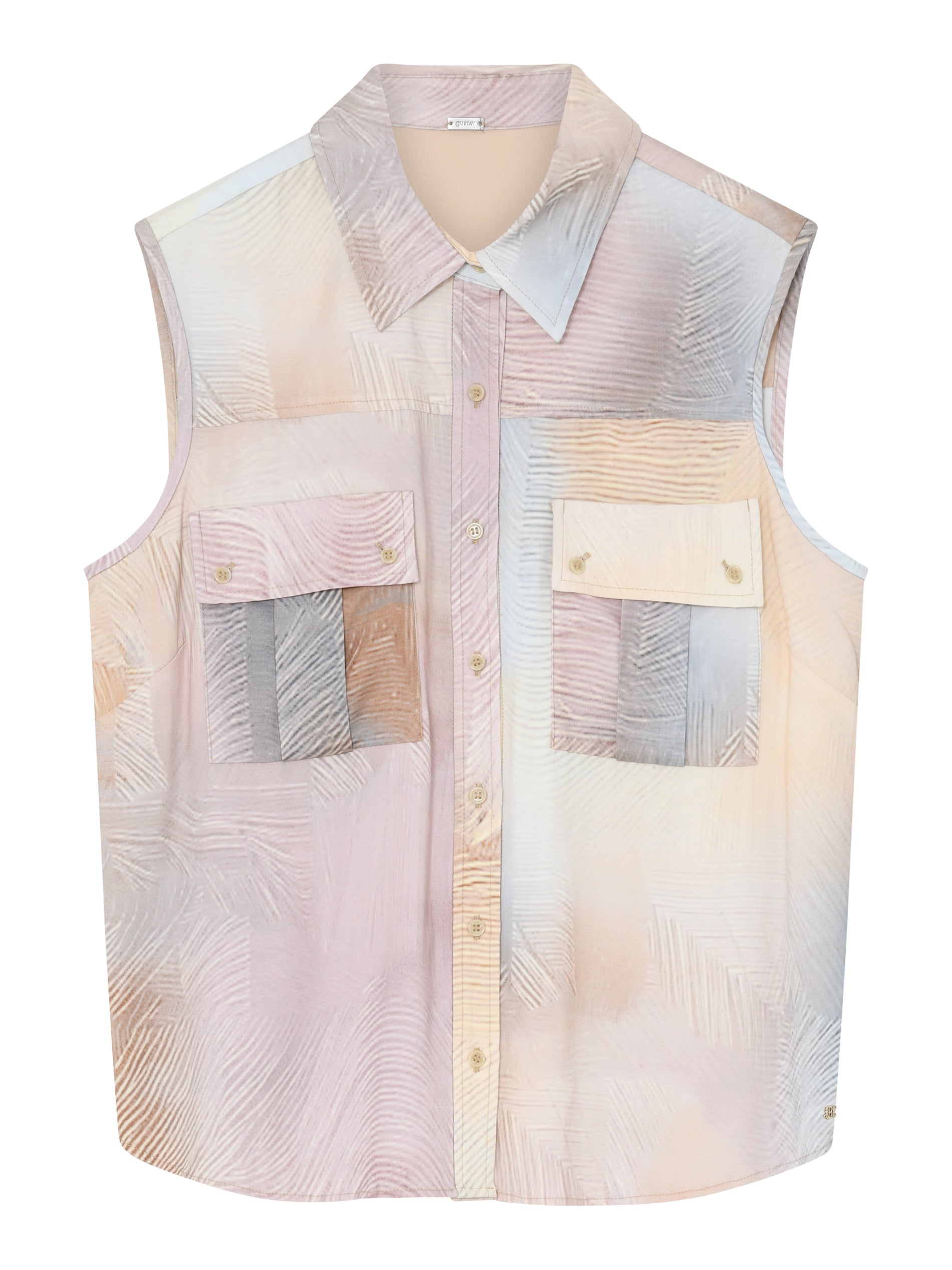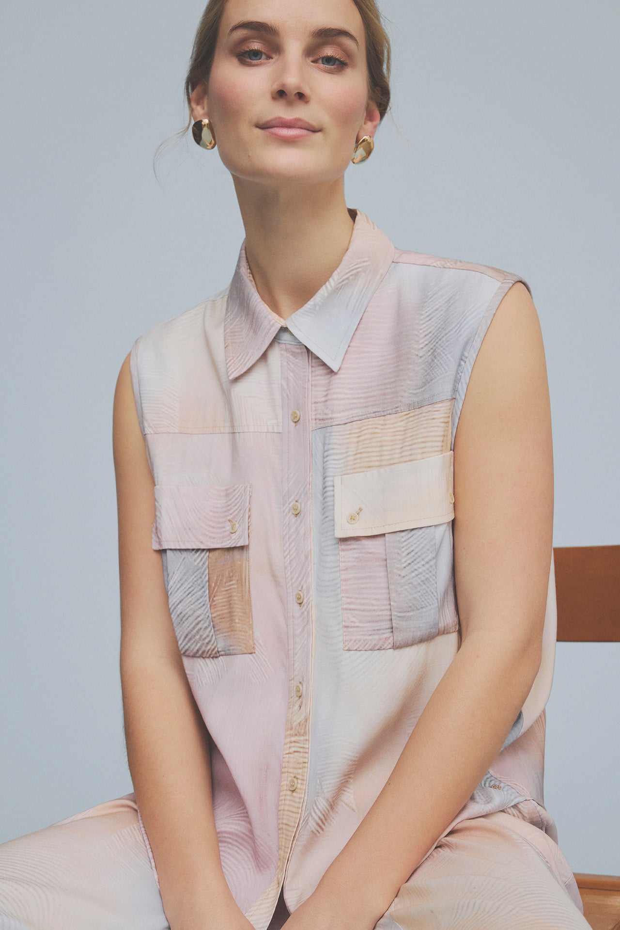 Ilona er en ærmeløs top med et karakteristisk mønster i bløde nuancer, der giver et flot spil til dit outfit. Toppen er designet med en klassisk krave og en gennemknappet front, som komplementeres af to brystlommer med klapper. Materialet består af en blanding af viskose og elastan, hvilket giver stoffet en smule stræk. Den har en lige afslutning forneden, der gør den velegnet til at bære både løst og nede i en underdel.