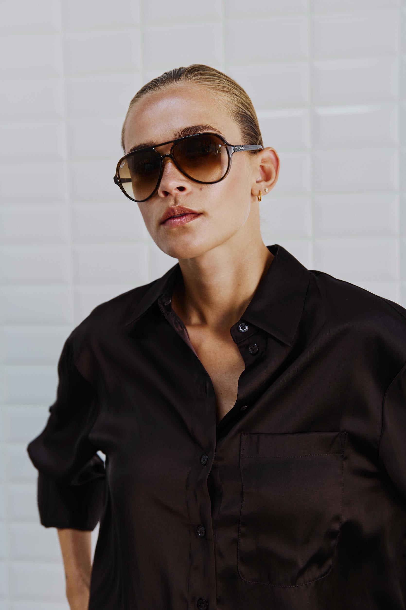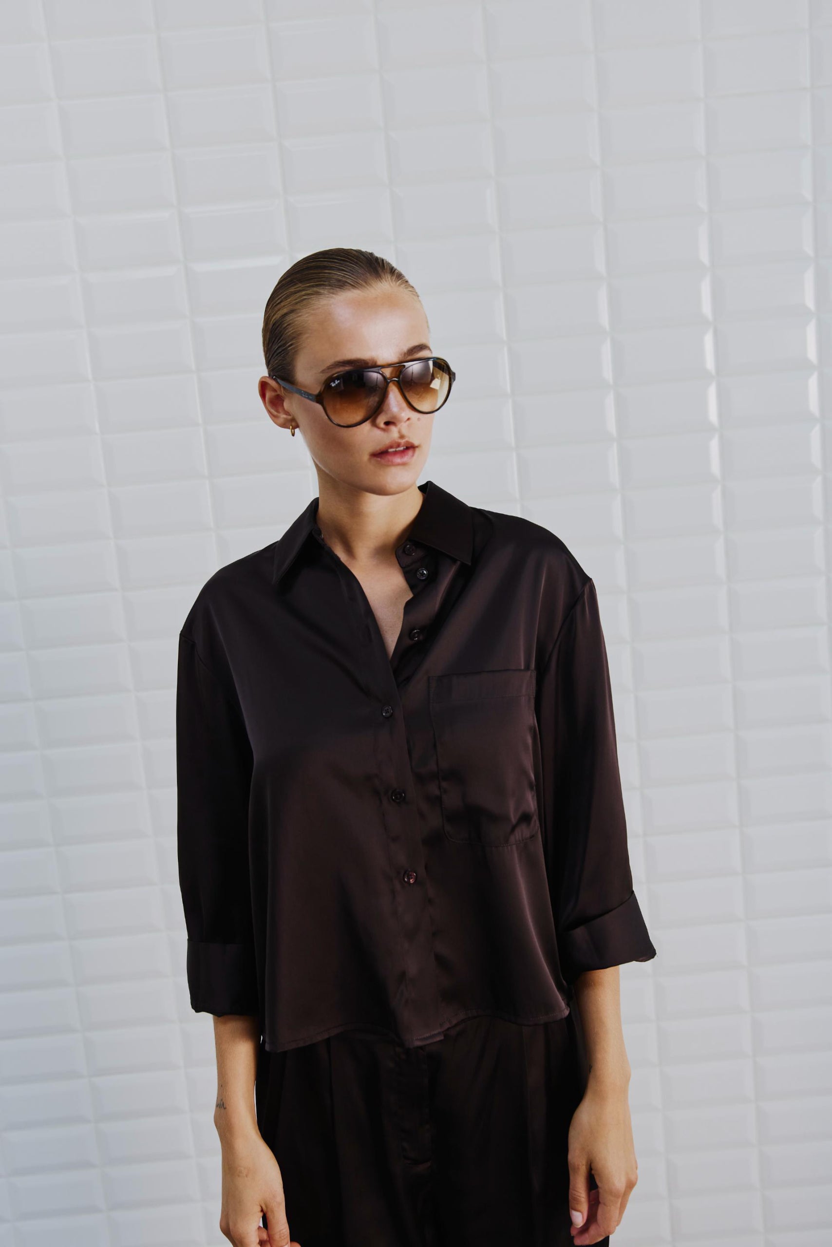 Kombiner skjorten med et par lyse habitbukser for at skabe en flot kontrast til den mørkebrune farve. Du kan også bruge den sammen med en tætsiddende nederdel, hvis du ønsker et mere formelt udtryk til hverdagen. Skjortens sateen-finish gør, at den også fungerer rigtig godt sammen med et par klassiske jeans, hvor materialernes forskellige overflader giver et spændende spil. Den afslappede pasform gør den behagelig at have på gennem hele dagen.